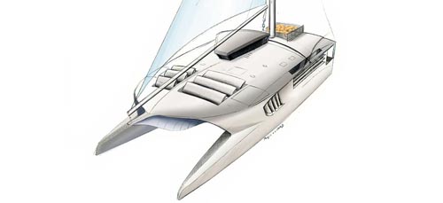 Developed in collaboration with a boat dealer in Dubai, the Tan 66 was designed to sail at very high speeds while remaining easy to handle, although production has yet to begin. To be built entirely in carbon fibre for greater velocity, rigidity and power, this innovative catamaran has been optimized (helm stations, mast amidships, roller-furling foresails) so she can reach high speeds safely and with little effort on the part of the crew.